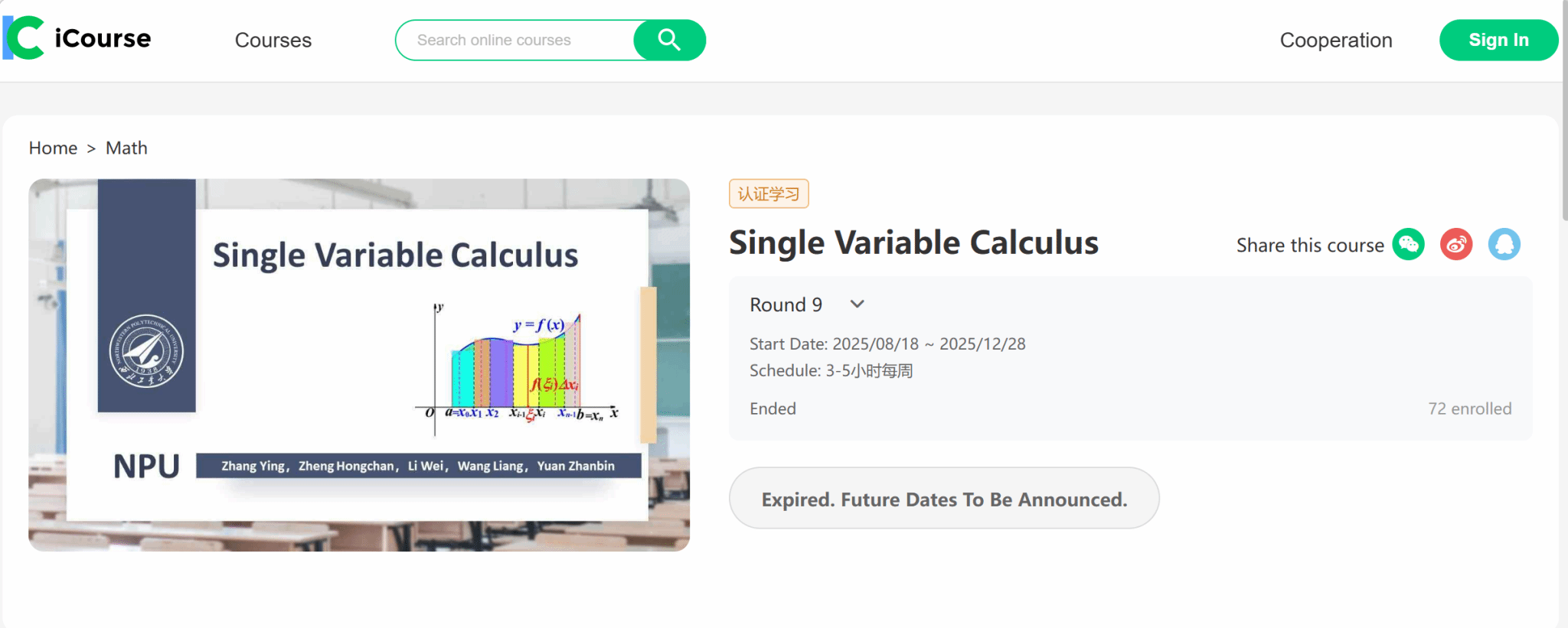 2.Single Variable Calculus(单变量微积分)国际爱课程平台课程链接,可进入课程介绍页,参加学习://www.icourse163.org/en/mooc/course/NPU1-145825216