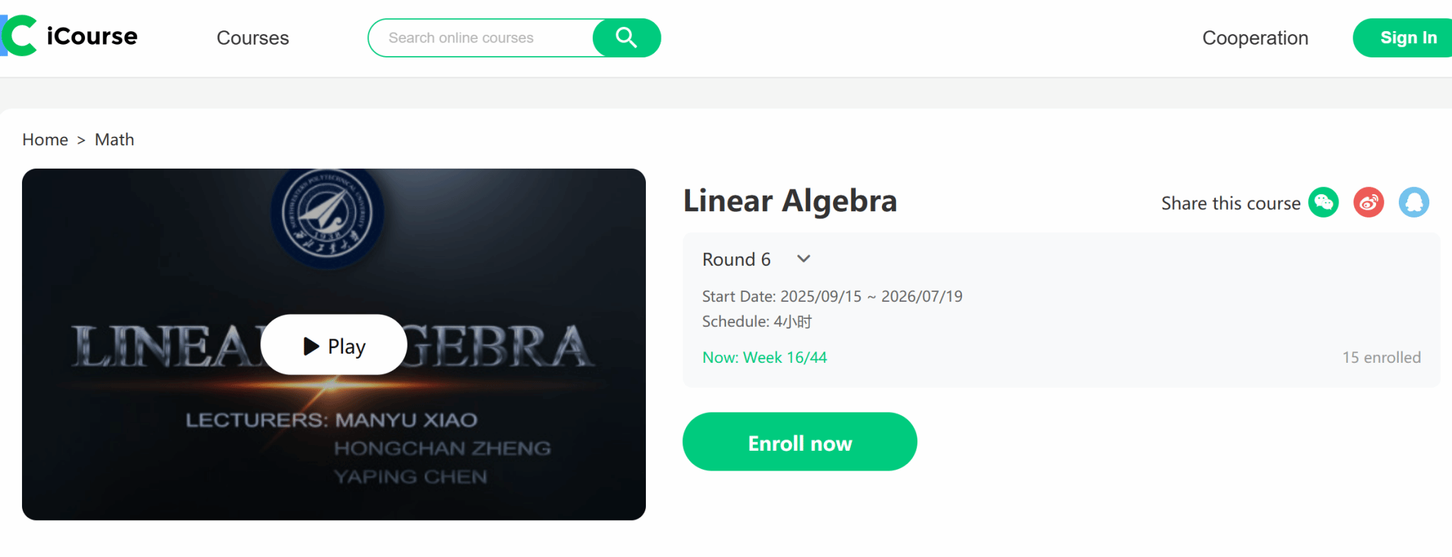 1.Linear Algebra(线性代数)国际爱课程平台课程链接,可进入课程介绍页,参加学习://www.icourse163.org/en/mooc/course/NPU1-1458030173