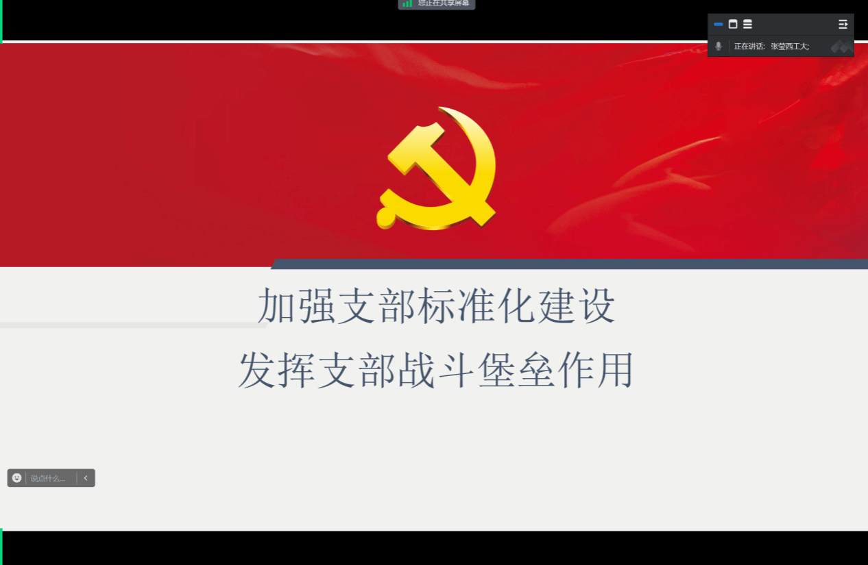 随后,本科生高年级第二党支部书记李加淳从如何带领党支部组织开展活动方面分享了自己的经验。他介绍了本科生高年级第二党支部“三会一课”活动的开展情况,并分析了学生党支部普遍存在的问题及解决措施,为其他学生党支部提供了参考。兼职辅导员柴艺瑞按照《中国共产党支部工作条例(试行)》相关要求,以学生党支部标准化建设为主题进行了细致分享。
