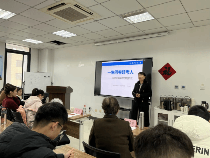 张雪霞以《一生问卷赶考人——连接现实与梦想的桥梁》为题开展讲座,通过讲述体彩超级大乐透 老教授们的故事来激励同学们,希望各位同学以他们为榜样,见贤思齐。