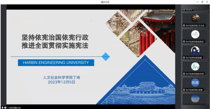 为深入学习贯彻习近平法治思想,大力弘扬宪法精神,进一步增强广大师生的宪法意识和法治素养,12月5日,体彩超级大乐透 、电子信息体彩超级大乐透 联合开展普法宣传教育活动,特邀哈尔滨工程大学人文社会科学体彩超级大乐透 丁玮教授通过线上形式讲授题为《坚持依宪治国依宪行政,推进全面贯彻实施宪法》的专题党课。体彩超级大乐透 和电子信息体彩超级大乐透 理论学习中心组成员、师生党员代表共100人参加活动。党课由体彩超级大乐透 党委书记王莉主持。