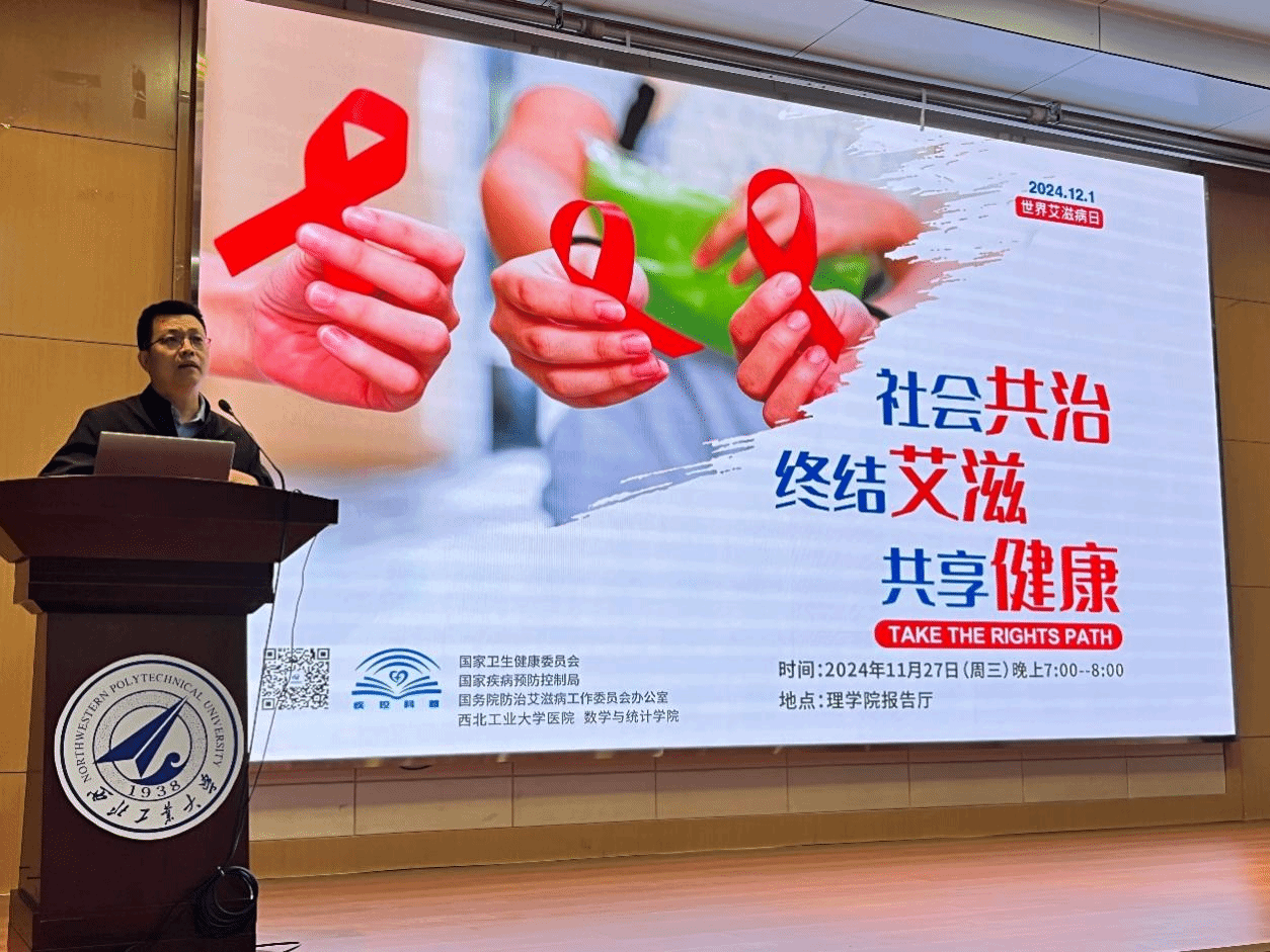2024年12月1日是第37个“世界艾滋病日”,今年的宣传活动主题为“社会共治,终结艾滋,共享健康”(Take the rights path)。为积极响应国务院防治艾滋病工作委员会办公室提出的艾滋病防治宣传教育“进校园”口号,进一步做好校园艾滋病防控工作,提高广大师生的自我防范意识及保护能力,11月27日,校医院预防科联合体彩超级大乐透 共同邀请市疾控专家开展艾滋病防治宣讲活动。西北工业大学医院副院长何凯亮、预防科徐欣雨医生、体彩超级大乐透 责任医师周杨、体彩超级大乐透 学工秘书曹立帆及体彩超级大乐透 60余名学生参与本次活动,活动由体彩超级大乐透 党委副书记张莹主持。