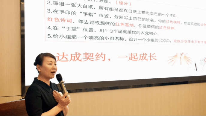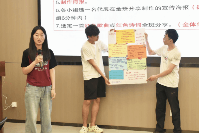 汇报环节,各组代表依次上台阐释讨论成果,共同朗诵红色诗歌,展现了团队的智慧与创造力。现场,学员们积极互动,各小组间进行了精彩点评。王莉老师肯定了学员们在团队协作中的出色表现,也从内容深度、逻辑架构等方面提出了宝贵建议,引导学员们进一步思考如何在未来的学习、生活和工作中更好地践行红色精神,发挥党员发展对象的模范带头作用。