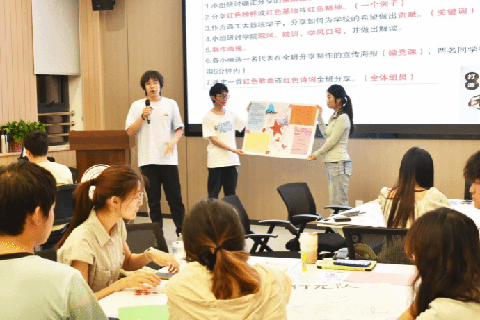 课上,王老师着重强调了团队建设的重要性。学员们被分成5个小组,围绕个人入党初心、红色榜样、红色诗词及红色精神等多个富有意义的主题,结合手绘、拼贴等艺术形式进行了创意性表达,现场气氛高涨。在王老师的指导下,各小组有条不紊地发散思维,并将讨论成果以海报的形式进行呈现。