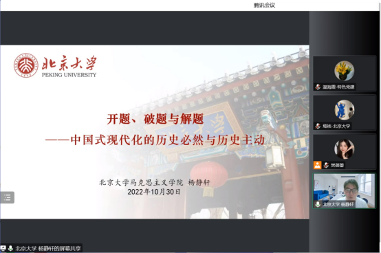 随后,杨静轩同志围绕《开题、破题与解题——中国式现代化的历史必然和历史主动》主题,引用马克思主义经典著作中的重要论述对中西方不同现代化模式进行了对比,衍生出中国式现代化的中国特色。之后她从历史脉络的纵向发展中、从中国共产党对现代化发展道路的艰难选择中、从历史发展的必然性和实践的证明中推演出中国式现代化的特征和本质要求,并指出实现中华民族伟大复兴必然要选择中国式现代化道路。