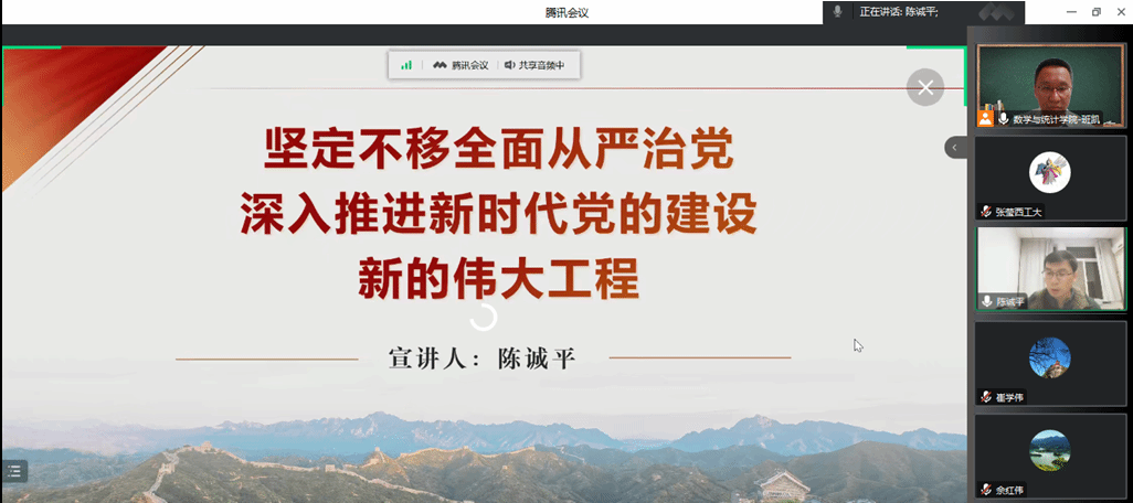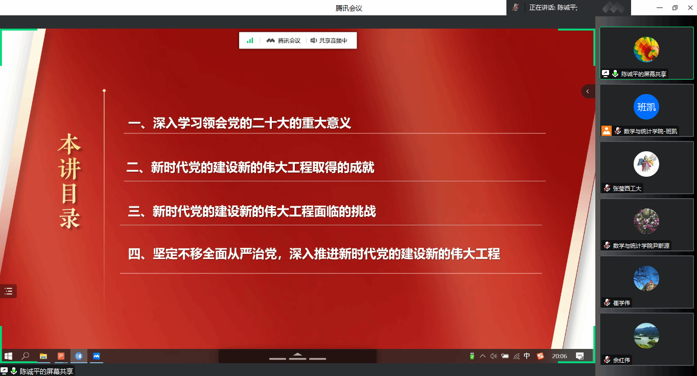为进一步贯彻落实体彩超级大乐透 新学期《关于加强党的二十大精神学习宣讲的通知》内容要求,3月22日,体彩超级大乐透 特邀体彩超级大乐透 马克思主义体彩超级大乐透 教师理论宣讲团陈诚平副教授作了题为《坚定不移全面从严治党,深入推进新时代党的建设新的伟大工程》专题党课。体彩超级大乐透 教工党支部全体同志,学生党支部代表,与体彩超级大乐透 数学科学系党支部共建支部西北大学基础数学系党支部代表通过线上形式共同参会。会议由体彩超级大乐透 院长助理班凯主持。