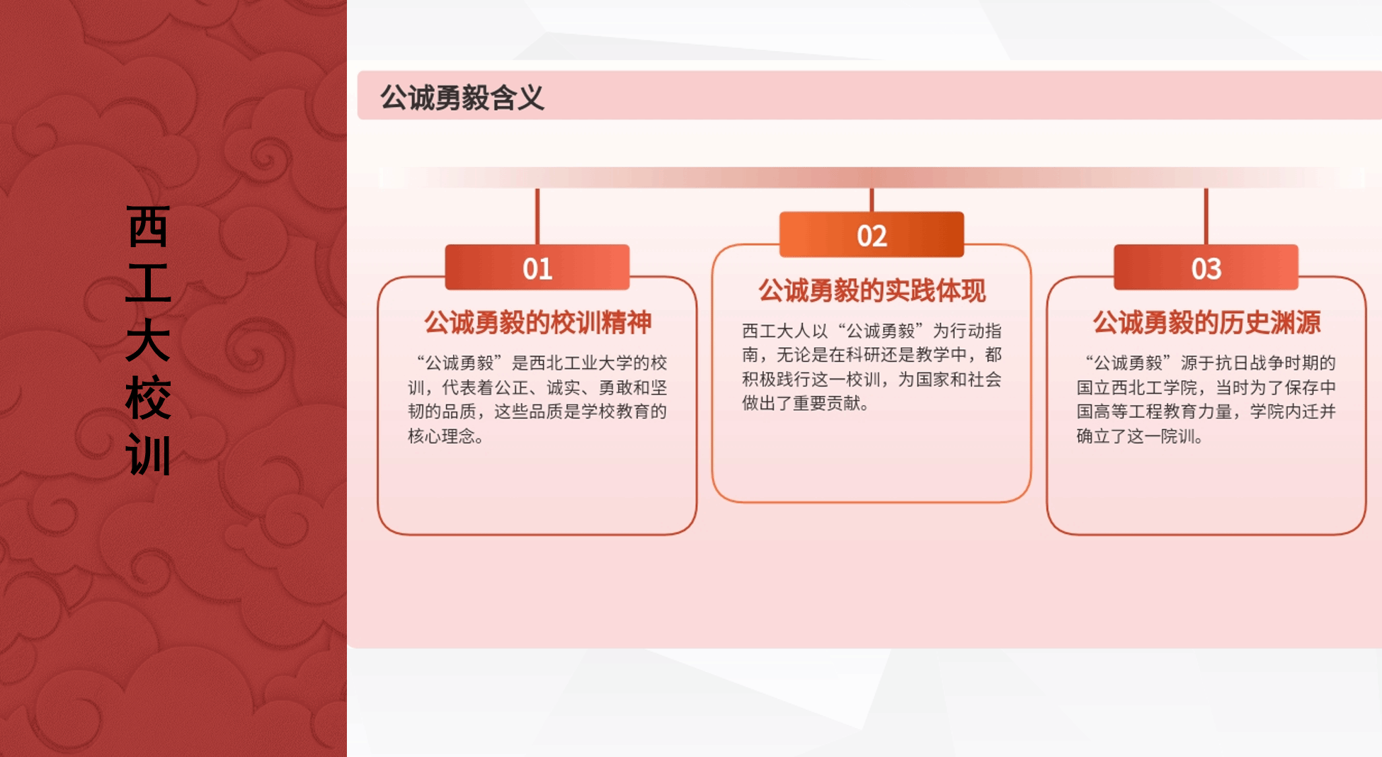 分享会首先解析了"公诚勇毅"校训的深层意蕴。1938年国立西北工体彩超级大乐透 成立之初确立的"公诚"精神,历经抗战烽火淬炼,在1957年西安航空体彩超级大乐透 与西北工体彩超级大乐透 合并组建西工大时,融入"勇毅"新内涵,形成完整校训体系。