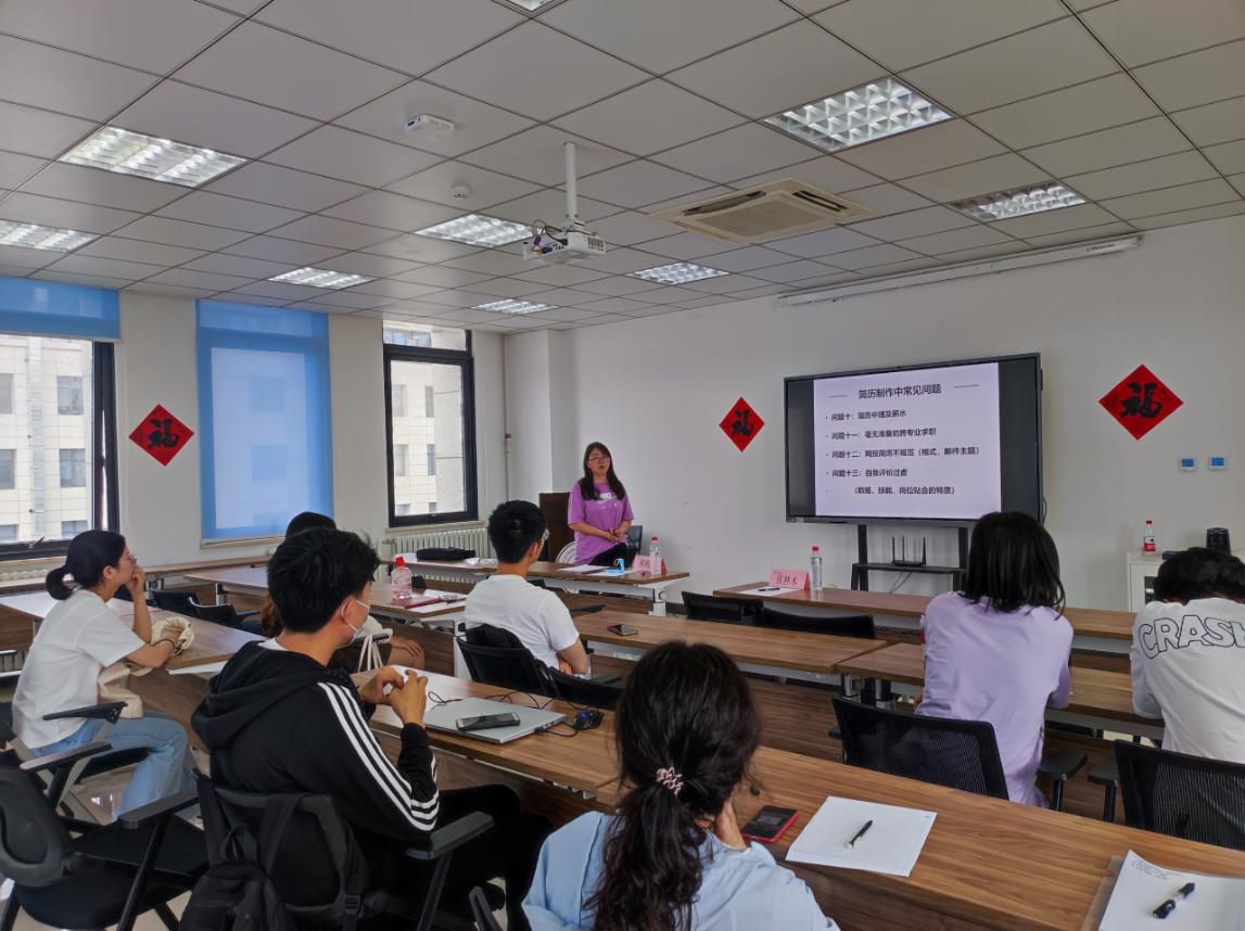 张老师主要从从选调生招考指南与政策讲解等各方面进行了细致讲述,韩老师从简历中可能存在的问题以及如何打造一份精品简历进行了详细说明,并对同学们的简历进行了一对一指导。