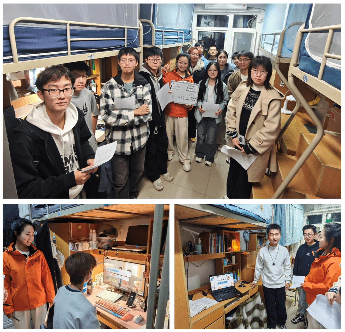 11月20日,辅导员张倩、兼职辅导员朱利与2025级各班学生代表一同走访了参赛宿舍,并进行现场评审。经过综合评议,最终评选出获奖宿舍如下: