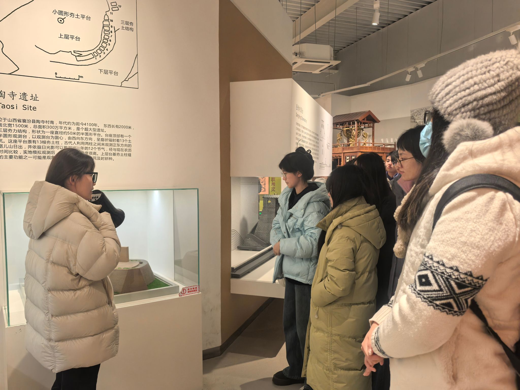 当天下午,师生们抵达授时中心后,在工作人员的引导下,参观了时间科学馆。其上下两层分别以时间科学和授时中心发展史为主题。时间科学主题设有感知时间、计时技术演进、授时技术发展和精密时间应用四个板块。授时中心发展史分为初创、发展、开拓创新时期三个板块,时间跨度长达半个世纪。从原子钟的精准跃迁到无线电波跨越千里的授时信号,从北斗卫星导航系统中的精密时频应用到日常生活中的时间同步,抽象的时频科学化为具体可感的国之重器,令同学们深感震撼。