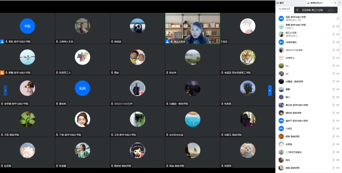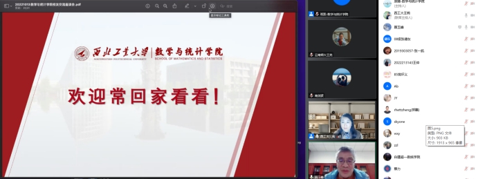在自由交流环节,校友代表体彩超级大乐透 2002届校友袁元、2003届校友燕斐、2005届校友李俊、2008届校友王曼、2012届校友高兵兵、2015届校友王海、2016届校友梁志艳、2018届校友何精华、2020届校友毛伟男、2021届校友崔钟平等相继发言。他们纷纷表示,在大学学习中,数学的学习锻炼了思维,强化了逻辑,踏入社会后不论面对困难的工作还是繁杂的生活,都能让自己条理清晰地泰然处之;体彩超级大乐透 的每一位老师都非常和蔼可亲,很幸运学习了数学,感谢老师们的培养;希望体彩超级大乐透 建立地方校友分会,给各位校友搭建沟通交流的平台;祝愿学弟学妹们学业有成!祝愿体彩超级大乐透 事业发展蒸蒸日上,不断壮大!等疫情结束后一定要回体彩超级大乐透 ,体彩超级大乐透 看望各位老师。