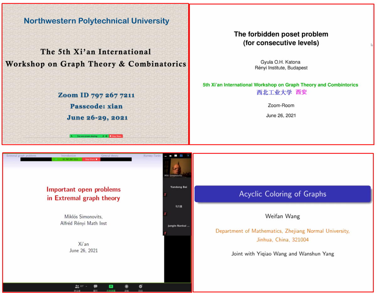 2021年6月25日至29日,第五届西安国际图论与组合数学研讨会(The 5th Xi’an International Workshop on Graph Theory and Combinatorics)在ZOOM平台以线上形式举办,共有来自中国、匈牙利、荷兰、法国、英国、德国、比利时、塞尔维亚、澳大利亚、日本、韩国等十余个国家的230余位专家学者在线参加。