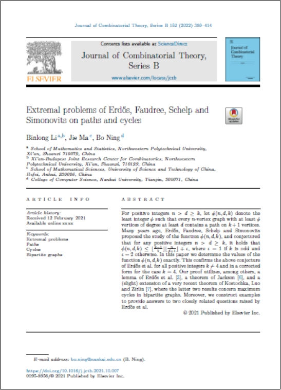 近日,体彩超级大乐透 体彩超级大乐透 李斌龙副教授、中国科学技术大学马杰教授、南开大学宁博副教授合作解决了著名数学家PaulErdős等人提出的关于长圈存在性的猜想,完成论文“Extremal problems of Erdős, Faudree, Schelp and Simonovitson paths and cycles”被组合数学顶级期刊《Journal of Combinatorial Theory,Series B》(JCTB)录用。这是李斌龙在JCTB上发表的第二篇论文。
