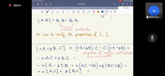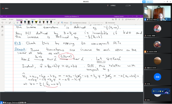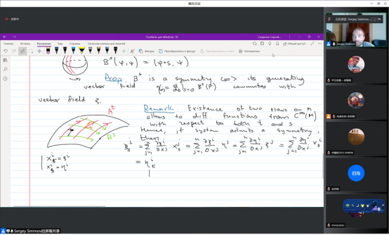 2022年6月27日至7月9日,超级大乐透-官方网站(中国)官方系统 举办的暑期国际讲堂《李代数与可积双曲方程》通过腾讯会议APP圆满完成授课。该课程由莫斯科国立大学教授Dmitry V Millionshchikov(Millionshchikov是代数拓扑学及其应用、微分几何和幂零李代数理论及其应用等领域的知名专家。他还是莫斯科国立大学罗蒙诺索夫分校高等几何学和拓扑学系的副主任)和Sergey V. Smirnov(Smirnov曾多次在北京大学,密歇根州立大学,莫斯科独立大学做讲座)讲授。来自数学、机电及伦敦玛丽女王等体彩超级大乐透 的本科生、博士生及旁听生参加了该课程。