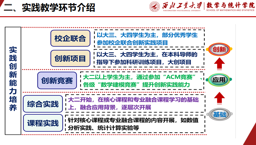 的实践教学平台、实践教学环节的创新项目、创新竞赛、综合实践及实验课程等,并建议同学们规划好自己的大学生活,积极参加各类实践活动,鼓励同学们多参加数学类学科竞赛。