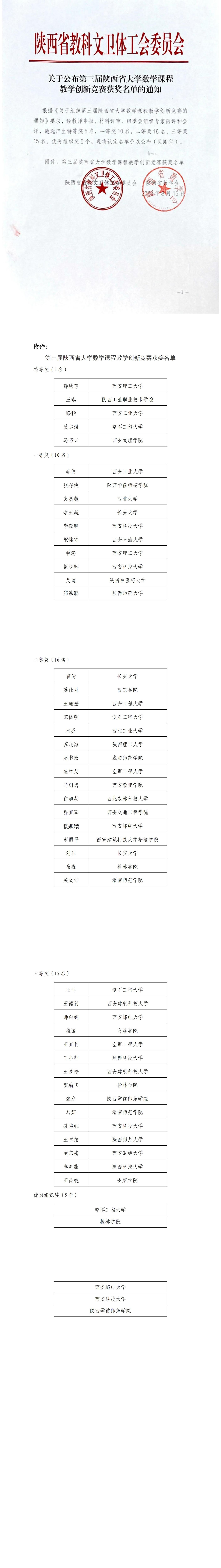 关于公布第三届陕西省大学数学课程教学创新竞赛获奖名单的通知