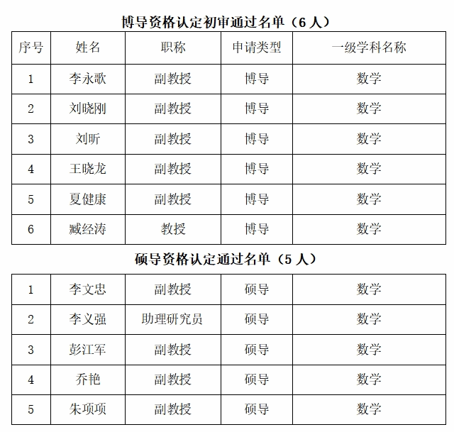 经教师申报,体彩超级大乐透 审核,对破格申请博导的送校外同行评议,并组织学位评定分委员会及导师资格认定小组评审,现将导师资格认定体彩超级大乐透 评审结果予以公示,公示期为3个工作日,如有异议,请在公示期内向教学办公室反映。以下名单按照姓名首字母排序。