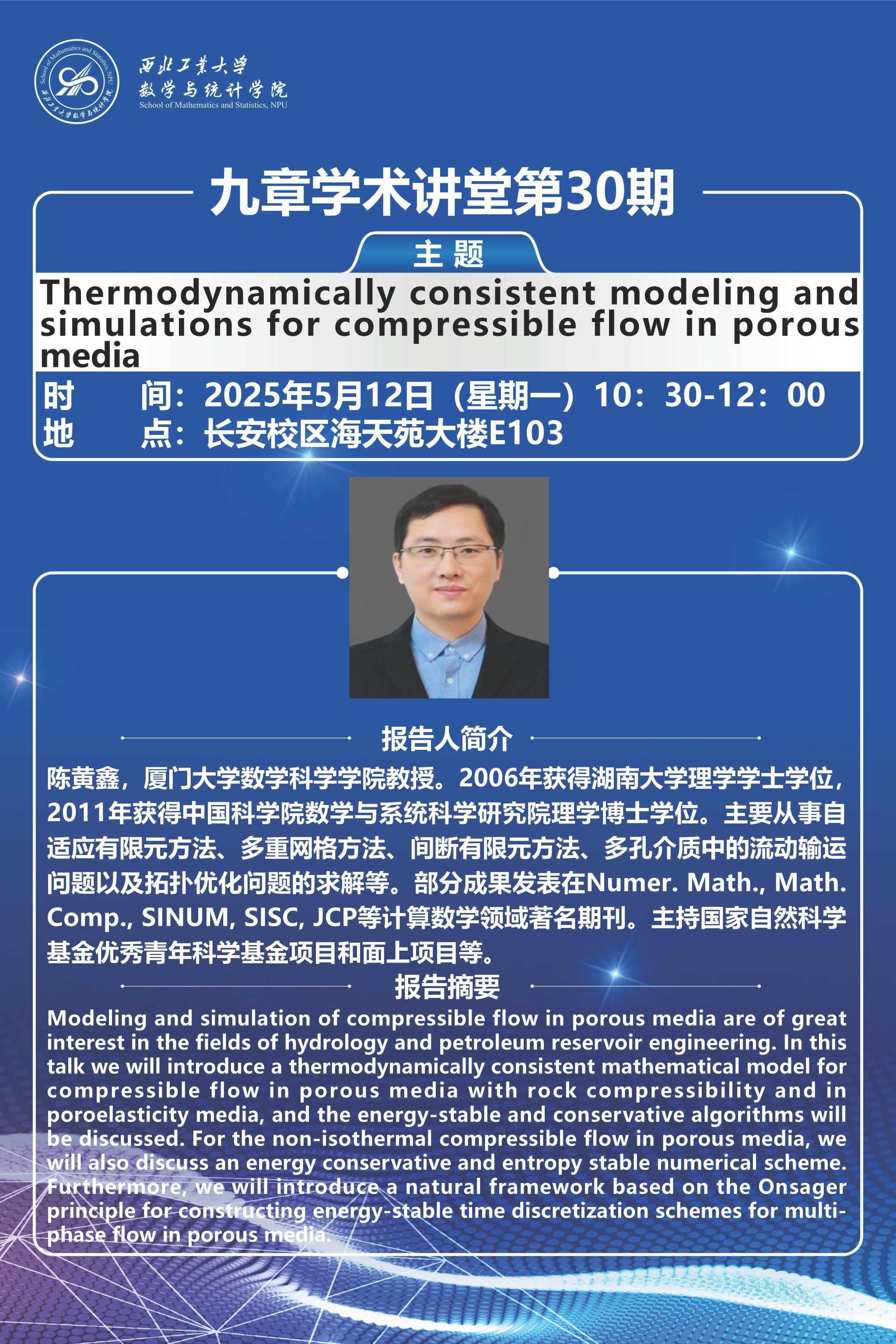 【九章学术讲堂第30期】Thermodynamically consistent modeling and simulations for compressible flow in porous media
