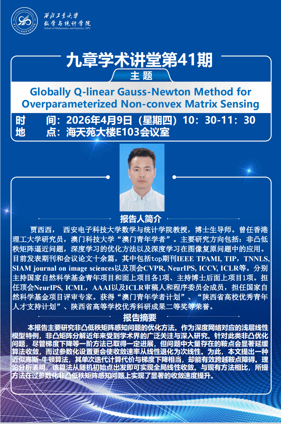 【九章学术讲堂第41期】Globally Q-linear Gauss-Newton Method for Overparameterized Non-convex Matrix Sensing