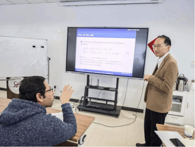 报告会上,Inahama教授系统地介绍了粗糙微分方程的背景,粗糙路径理论的相关内容,以及平均原理的核心思想,拓宽了老师与学生的研究思路,也为其他方向的老师学生科普了知识。在受控路径理论的框架下,Inahama教授提出了一类随机粗糙路径和布朗粗糙路径共同驱动的快-慢粗糙微分方程系统的强随机平均原理。