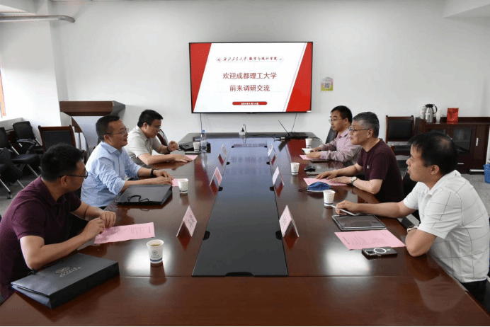 5月14日下午,成都理工大学党委副书记胡兵、数理体彩超级大乐透 院长刘浏、数理体彩超级大乐透 数学系主任冯俊一行三人来体彩超级大乐透 调研交流,体彩超级大乐透 院长聂玉峰,副院长徐根玖、郭千桥参加了调研座谈会。会议由聂玉峰主持。