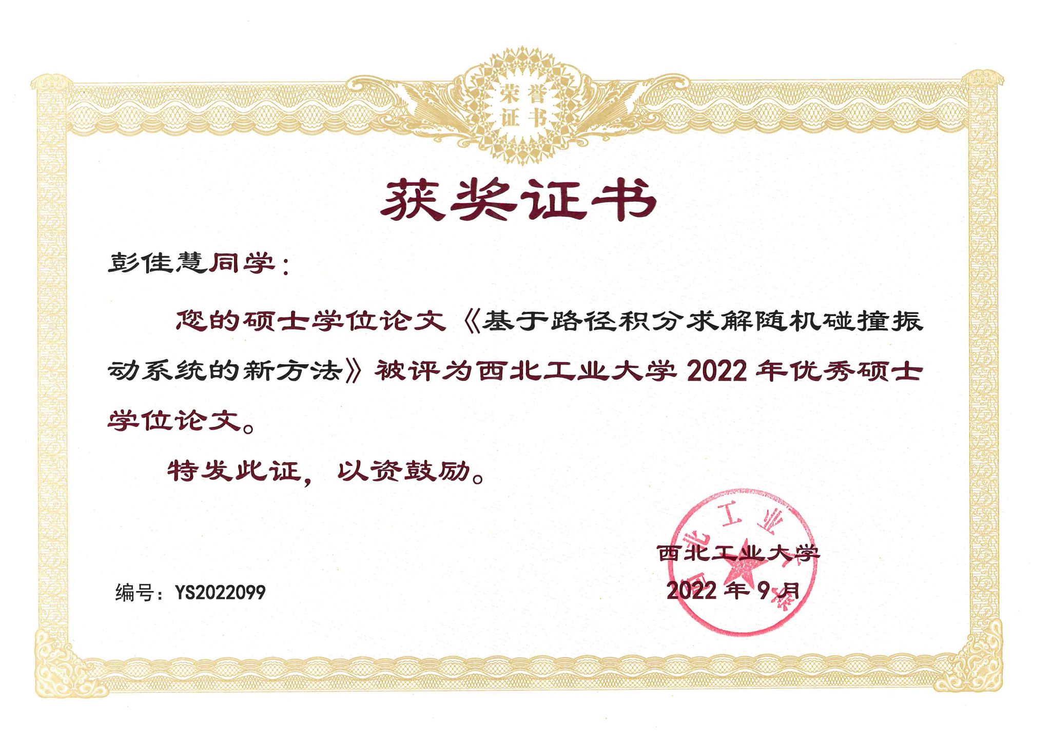 彭佳慧,女,概率论与数理统计专业,师从王亮教授,研究方向为随机碰撞振动系统的路径积分算法研究。硕士在读期间,以第一作者分别在国际著名期刊Nonlinear Dynamics和Chaos发表论文2篇,另协作发表高质量论文3篇。作为核心参与人参与军科委基础研究计划和国家自然科学基金等项目。荣获研究生国家奖学金、西北工业大学优秀研究生标兵、西北工业大学优秀毕业生以及陕西省优秀毕业生等多项荣誉。
