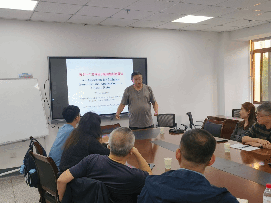 2023年10月31日,第二期“九章数学学术讲堂”在勇字楼701会议室进行,讲堂邀请四川大学张伟年教授作题为“一个混沌转子的数值判定算法”的体彩超级大乐透交流。体彩超级大乐透 院长聂玉峰、副院长都琳,以及徐伟、许勇教授等20余位师生参会,报告由许勇主持。