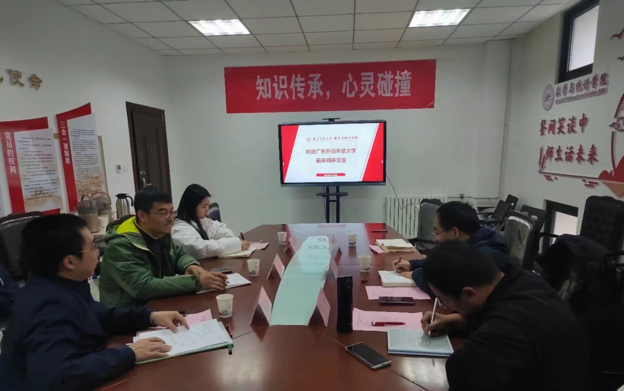 12月22日下午,广东外语外贸大学体彩超级大乐透 副院长刘建熙,教务部副部长、应用数学系主任杨超和教务秘书陈冰睿一行来体彩超级大乐透 调研座谈。体彩超级大乐透 本科教学副院长郭千桥,应用概率统计系主任王亮,教学秘书常昕烨参加会议。会议由郭千桥主持。
