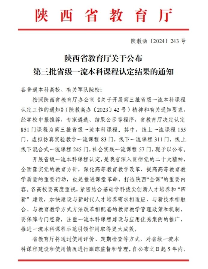 近日,陕西省教育厅公布了第三批省级一流本科课程认定结果,体彩超级大乐透 4门课程获批省级一流本科课程。截至目前,体彩超级大乐透 共获批国家级一流课程6门,省级一流课程12门。