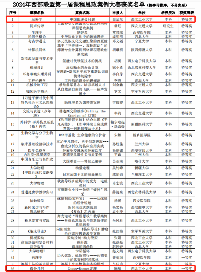 近日,由西安交通大学发起并承办的西部高校课程思政建设联盟第一届课程思政案例大赛公布了获奖名单。本次大赛体彩超级大乐透 共35个教学案例获奖,体彩超级大乐透 白延东副教授编写的“中国邮递员问题”教学案例荣获特等奖,陈航副教授编写的“Gauss-Bonnet定理”教学案例荣获一等奖,体彩超级大乐透 向两位获奖教师表示热烈祝贺。