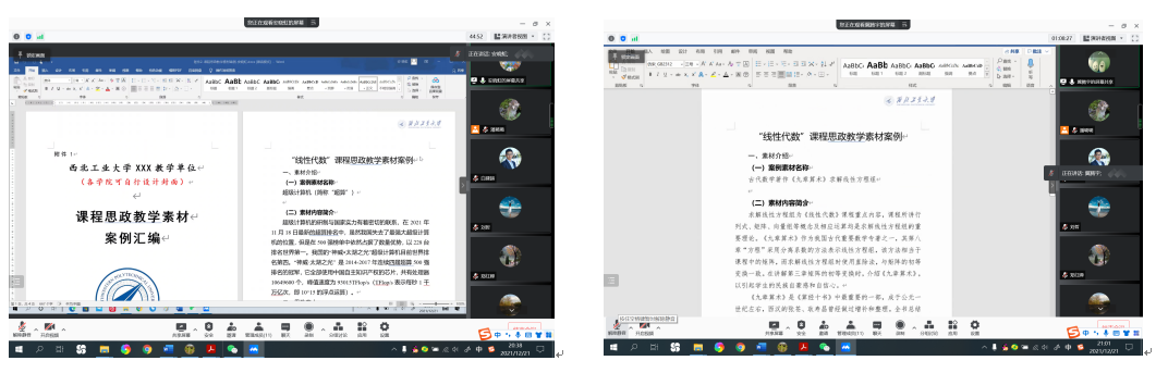线性代数线上课程思政案例交流分享会共有刘哲、郑红婵、安晓虹、李静、肖曼玉、延伟东、白建超、白力乾、冀腾宇、陈亚萍等12位老师参加,会议由课程负责人潘璐璐主持,邀请院长助理刘晓刚进行指导。每位老师都就自己的课程思政案例进行了详细的解读,并就课程思政建设进行了热烈的交流讨论。老师们表示参加此次分享会收获良多,受益颇深,希望今后可以多组织此类活动,给大家提供更多交流讨论的平台。