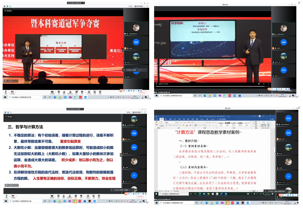 计算方法课程团队线上召开了课程思政案例交流分享会,院长助理王俊刚、计算科学系副主任王振海以及计算方法课程教学团队相关教师参加本次交流会,会议由课程负责人赵俊锋主持。会议首先学习了黑龙江高校课程教学竞赛本科赛道冠军说课视频以及教学展示,讨论了计算方法课程思政元素融入的途径和方法。随后,赵俊锋、佘红伟和荆菲菲三位教师分享了课程知识点融入思政元素的典型做法。王俊刚和王振海在总结中指出,课程思政要做到“如盐入水”,不能为了思政而思政,大搞形式主义,需要以身作则、强化思政修养,从数学史、算法史、数学哲学、共产党党史等方面汲取营养。