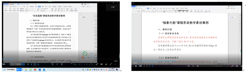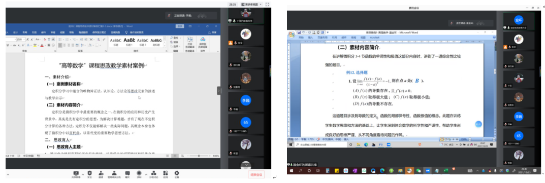 为贯彻落实一流本科人才培养行动计划,深入推进课程思政教育教学改革,加快建设体彩超级大乐透 课程思政素材案例库,12月19日至23日,依托体彩超级大乐透 课程思政示范教学中心,体彩超级大乐透 组织开展了课程思政素材案例系列分享交流会。交流会分别由3个专业课课程团队和5个公共课课程团队组织展开。3个专业课课程团队包括数学与应用数学、信息与计算科学、应用概率统计率类课程团队,5个公共课课程团队包括微积分、线性代数、概率论与数理统计、计算方法和复变函数与积分变换课程团队。每组由一位体彩超级大乐透 领导对接沟通指导,系主任、支部书记及公共课负责人进行组织,邀请部分老师分享课程思政素材案例。