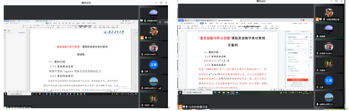 复变函数与积分变换课程团队的课程思政案例分享交流会共6名老师参加,会议由课程负责人马荣主持。会议主要围绕《复变函数与积分变换》课程教学内容的相关思政点进行交流分享,各位老师结合自己的经验,对课程思政案例进行介绍和分析。老师们表示通过参加此次分享会,对课程思政的理解更加深入,对个人课程思政教学有一定提升作用。