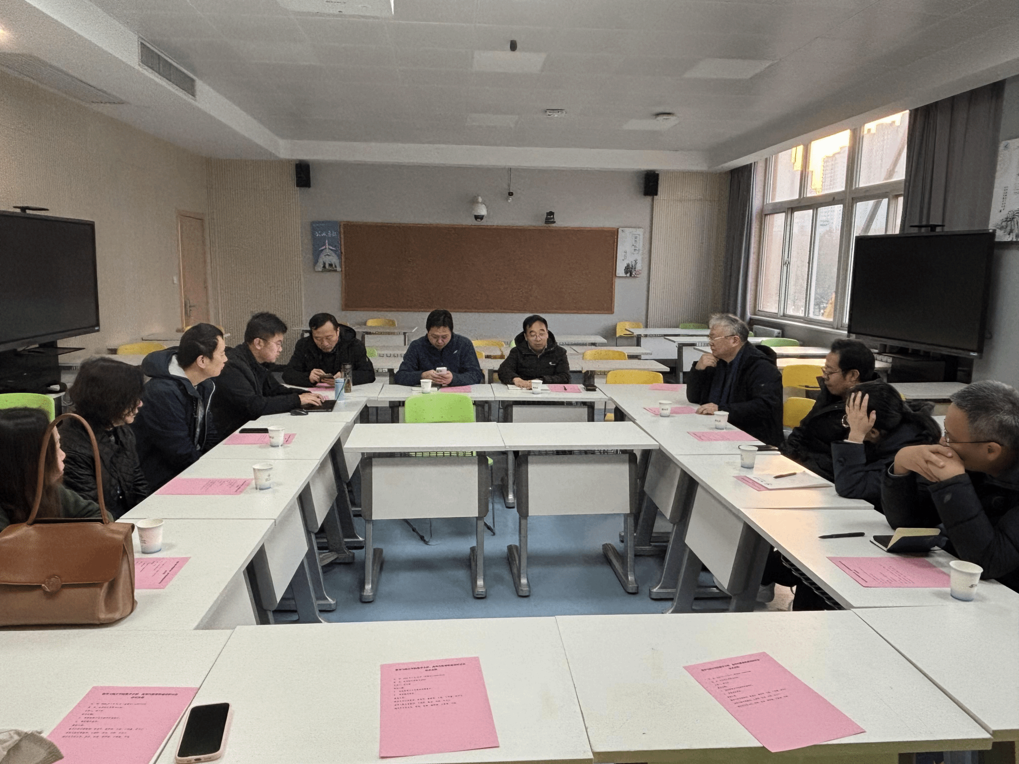 辅导员张倩汇报了2023级学生考研摸底数据,包括学生目标院校选择、下学期课程修读计划以及培养方案完成情况等。各班班主任分别补充介绍了本班相关学生的心理状态与学习近况。