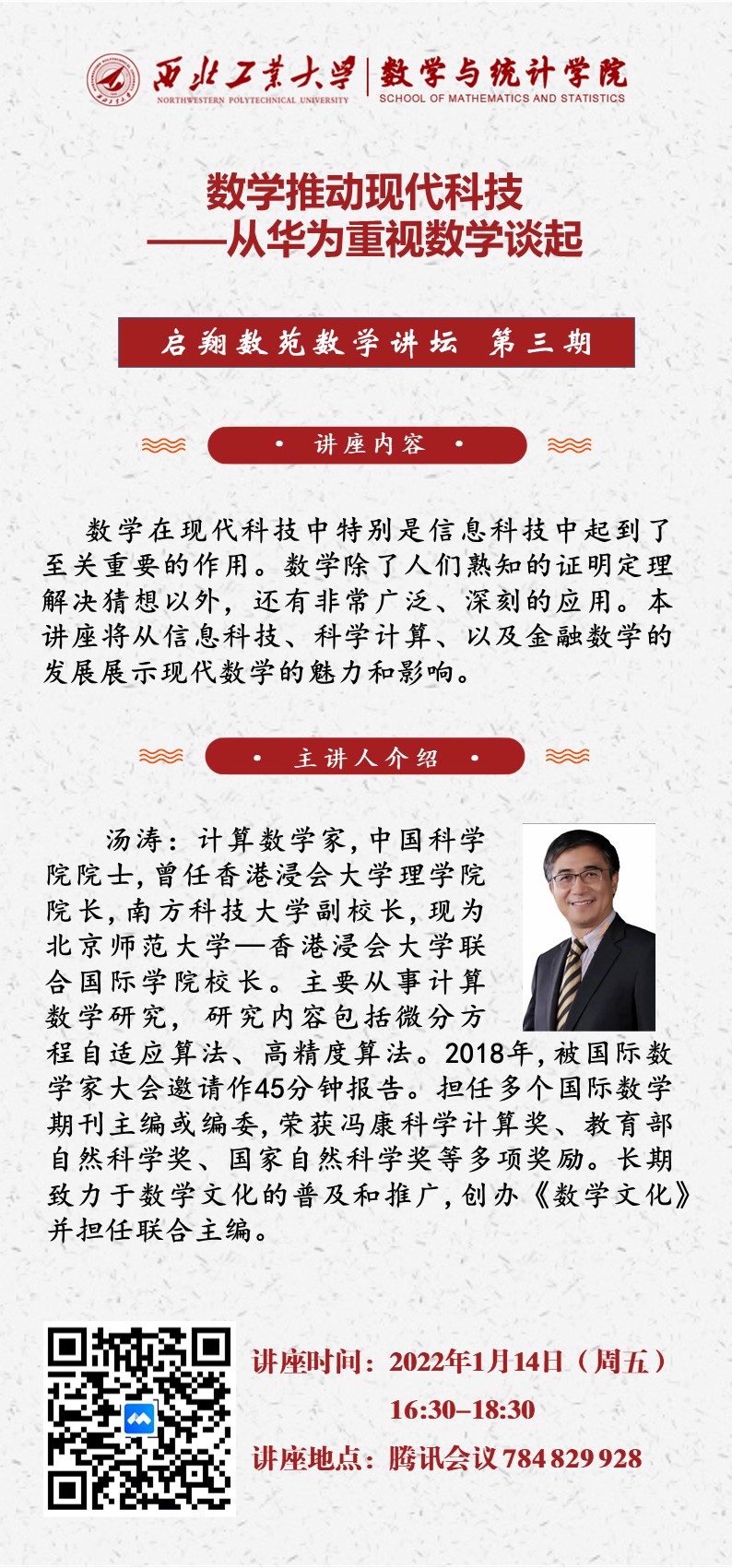 专家简介:汤涛, 计算数学家,中国科体彩超级大乐透 院士,曾任香港浸会大学理体彩超级大乐透 院长,南方科技大学副校长,现为北京师范大学—香港浸会大学联合国际体彩超级大乐透 校长。主要从事计算数学研究, 研究内容包括微分方程自适应算法、高精度算法。2018年,被国际数学家大会邀请作45分钟报告。担任多个国际数学期刊主编或编委,荣获冯康科学计算奖、教育部自然科学奖、国家自然科学奖等多项奖励。长期致力于数学文化的普及和推广,创办《数学文化》并担任联合主编。