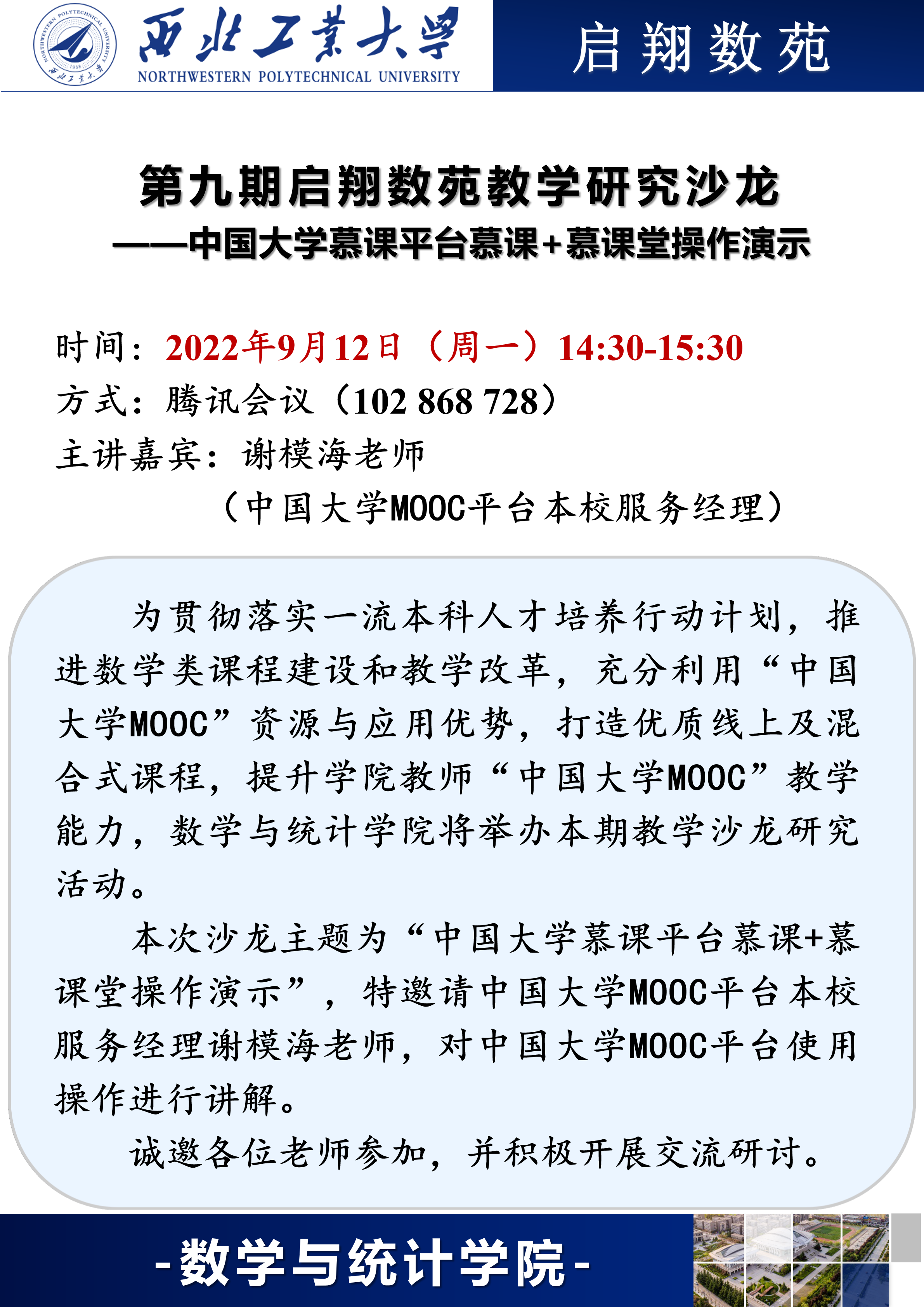 为贯彻落实一流本科人才培养行动计划,推进数学类课程建设和教学改革,充分利用“中国大学MOOC”资源与应用优势,打造优质线上及混合式课程,提升体彩超级大乐透 教师“中国大学MOOC”教学能力,体彩超级大乐透 将举办本期教学沙龙研究活动。