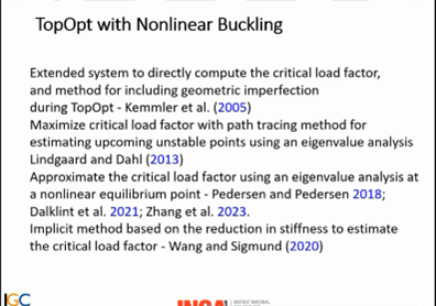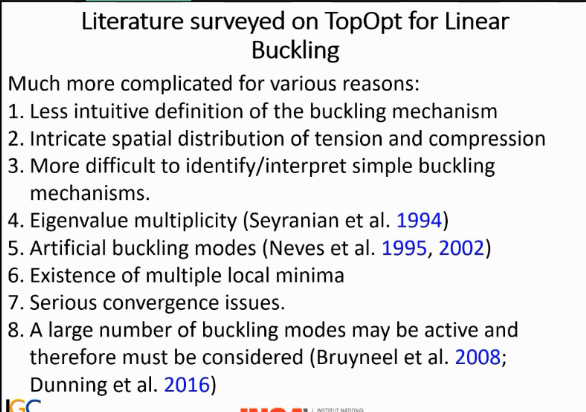 在接下来的课程中,Balaji Raghavin教授在之前的基础上建立了屈曲条件下的有限元单元矩阵以及如何在屈曲条件下进行灵敏度分析。随后Balaji Raghavin教授介绍了对于线性屈曲和非线性屈曲拓扑优化领域内的一些重要文章的基本思想,鼓励学生们进行更加深入的探索。