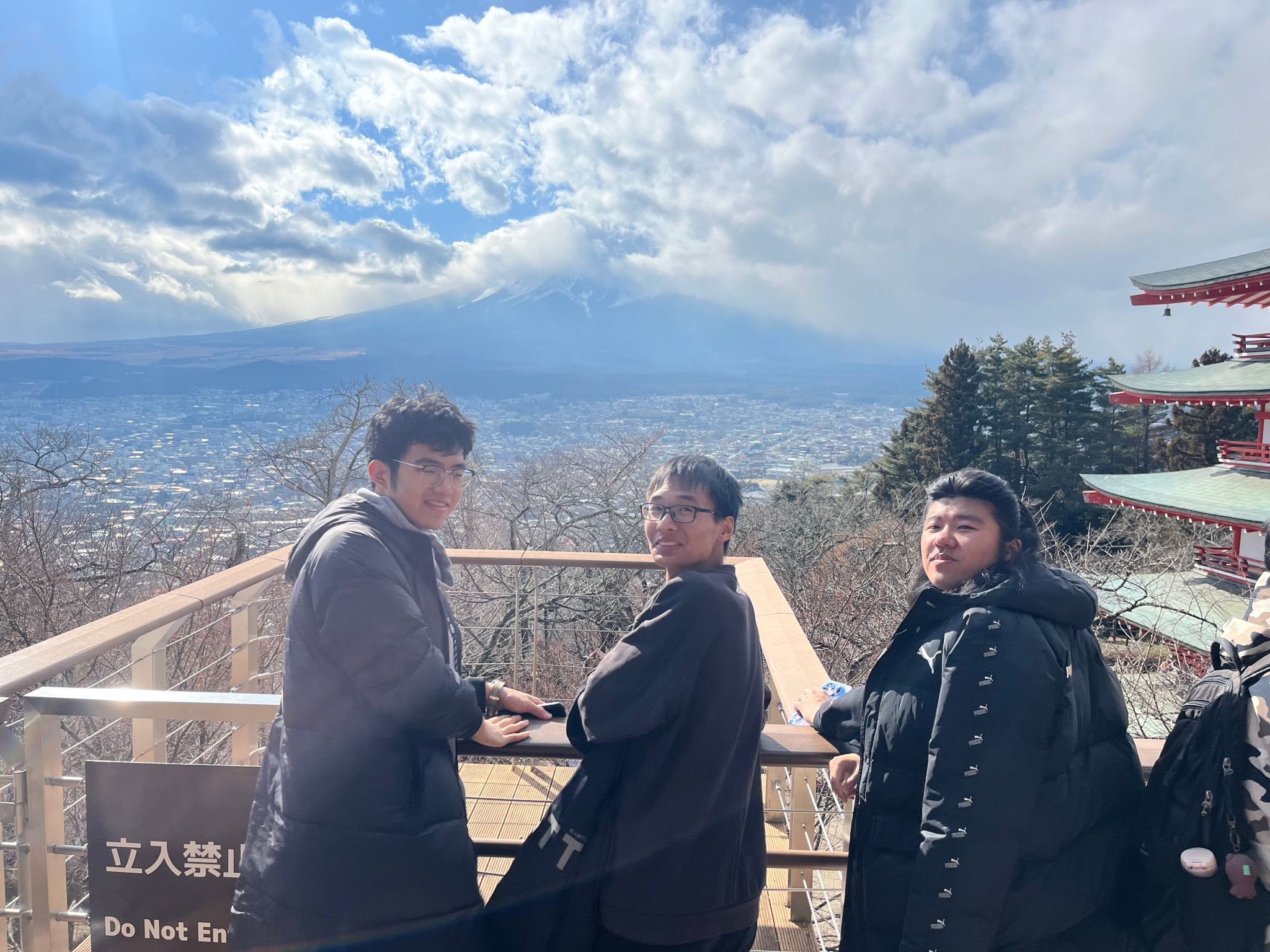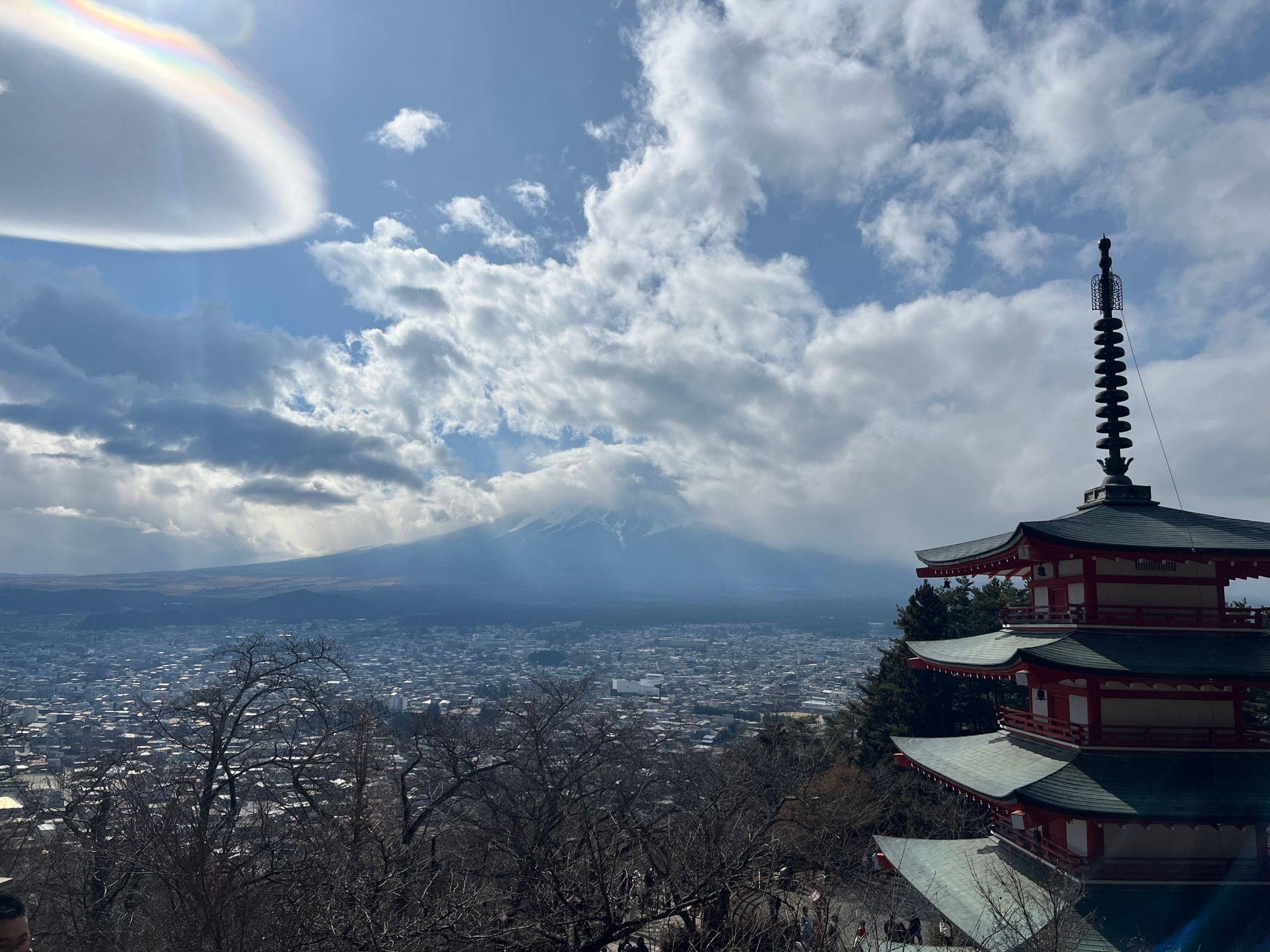 1 月 19 日,清晨惊喜降临。在富士山脚下的酒店,拉开窗帘,万里晴空下,富士山全景尽收眼底。随后,我们前往忍野八海。它位于山梨县忍野村,由富士山雪水融化后经地层过滤形成的八个清泉错落分布,故而得名。这里水温约 13℃,水质清冽,周边日式建筑与清澈泉水相得益彰,美如画卷。不远处的浅间神社,是富士山本宫浅间大社,作为浅间神社总本社,也是富士山信仰的中心。下午,抵达河口湖,富士五湖的中心,交通便利,是观赏富士山美景的绝佳之地,湖畔的怀旧巴士更是增添了一抹怀旧风情。在这趟人文之旅中,同学们深入体验了日本文化,为次日的项目汇报积蓄了满满的精神力量。