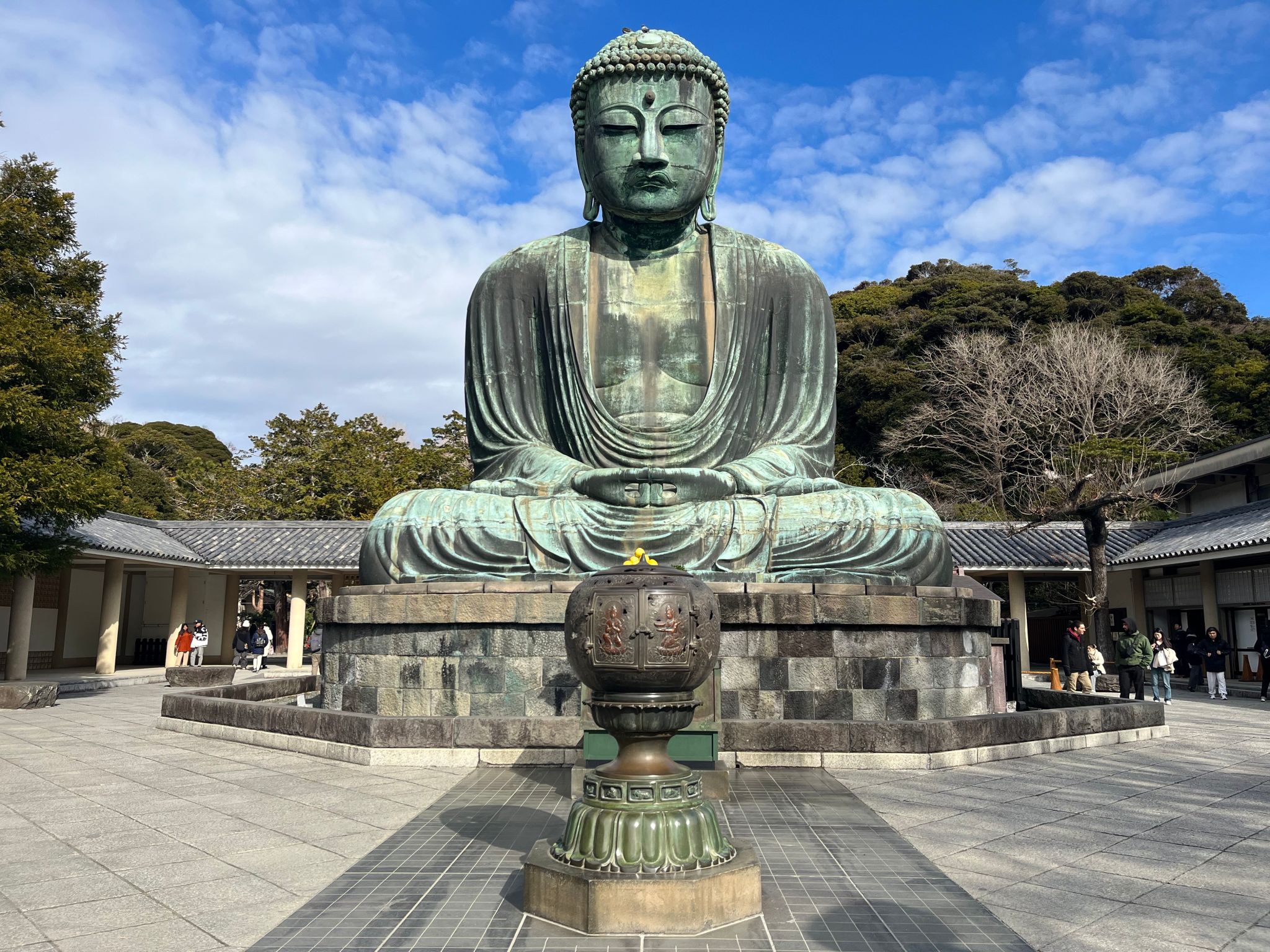 1 月 18 日,课程结束后,在肖老师和黄老师的带领下,开启了为期两天周末的人文参访之旅。首站是镰仓大佛,它伫立于古都镰仓的净土宗寺院高德院内,是镰仓时期塑像艺术的代表,建于1252年的佛像,以其宋代风格和精湛工艺,被列为日本国宝,见证了历史的沧桑。紧接着,乘坐电车前往《灌篮高手》的取景地——镰仓高校前,沿途的海岸风光美不胜收,让人心旷神怡。午后的时光,来到了湘南的代表景点——江之岛。岛上风景如画,古老的神社与各种传说故事相映成趣,浓厚的文化氛围让人流连忘返。夜幕降临,转向远处的富士山,这座被誉为日本三灵山之一、日本百名山的山峰,以“芙蓉峰”等美称著称,是日本人文标志的象征。