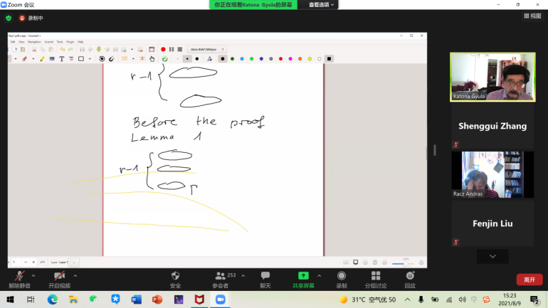 最后,Katona院士讲解了极值集合论中的Erdős-Ko-Rado类型问题,从k一致集合系统和非k一致集合系统两种情况出发,介绍了Katona圈序方法、shift方法和shadow方法等,并给出了Erdős-Ko-Rado定理的多种证明。
