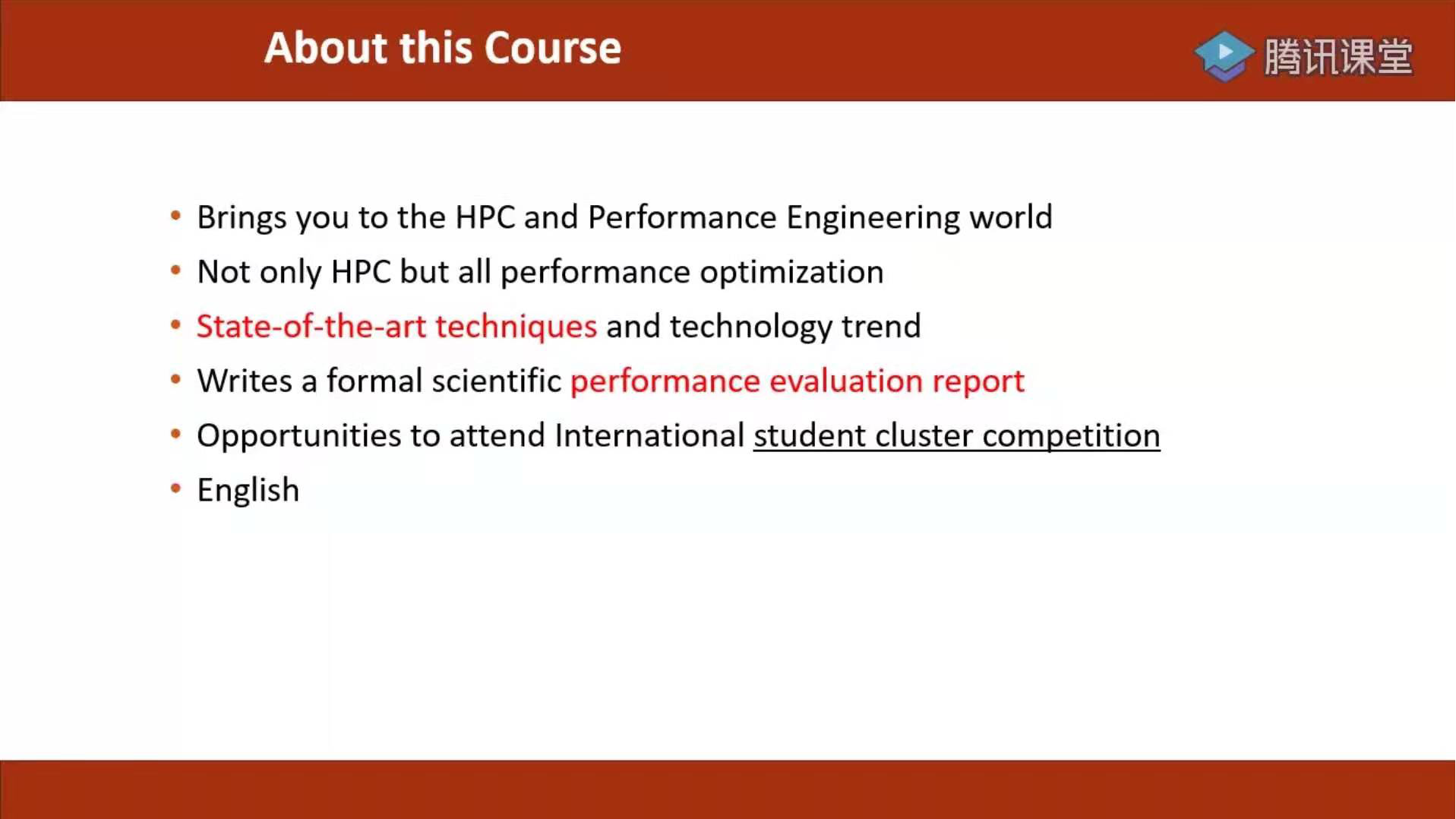 这门课程可以为学生未来继续探索高性能计算技术,以及在专业领域应用高性能计算和系统优化技术加速科学研究提供一个坚实的基础。