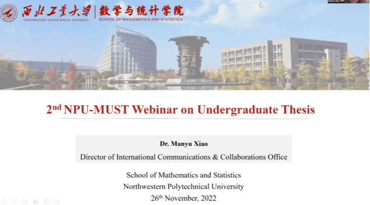 为进一步推进体彩超级大乐透 国际化工作水平,提升留学生培养质量,2022年11月26日上午10:00,体彩超级大乐透 与蒙古科技大学在ZOOM线上平台举行本科毕业论文工作推进会。会议由国际交流与合作办公室主任肖曼玉主持。出席本次会议的有体彩超级大乐透 副院长都琳、副院长郭千桥、应用概率统计系主任王亮、毕设导师王晓东、马荣、邢超(航天体彩超级大乐透 ),国际交流与合作办公室秘书李卓榕,蒙古科技大学数学系主任Battsetseg Gereltbyamba、副导师ARIUNGEREL Jargal、MUNKHGEREL Tsegmid、TAIGYNTUYA Bayaraa以及3名蒙古学生。