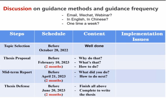肖曼玉老师首先对蒙古学生的毕业选题情况作了简单介绍,并表示体彩超级大乐透 以及体彩超级大乐透 高度重视本科留学生的毕业论文工作,从论文选题、开题、中期考核、答辩,对导师和学生都有严格的阶段性要求。接下来双边导师分别从学术背景、研究方向和科研成果等方面做了自我介绍,并对学生提出了自己的指导要求。应用概率统计系主任王亮老师强调,学生和双边导师要注重指导过程中的交流和反馈,这是成功完成毕设的必要条件,离不开双方的共同努力。蒙古学生如在其中遇到任何困难,可随时联系中国导师或中国学生。最后,双方导师就毕业论文的指导方式和指导频率展开了具体讨论。