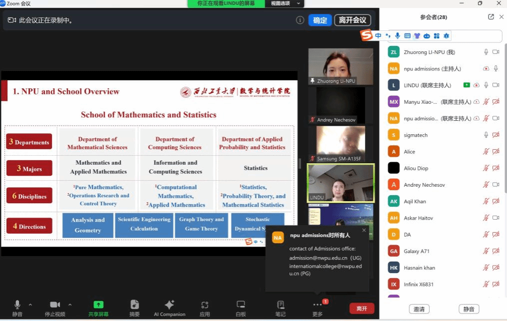 Firstly, Vice Dean Du Lin provided a comprehensive introduction to the basic information of our university, the departments and majors offered by our school, the faculty members, international education, and talent cultivation. Next, Director Xiao Manyu provided a detailed introduction to the top ten research teams of the school, their research directions. Miss. Yang Jiayi introduced the policies, application procedures, and requirements for freshmen scholarships, encouraging international students to further their studies at our university and enhance their academic qualifications.