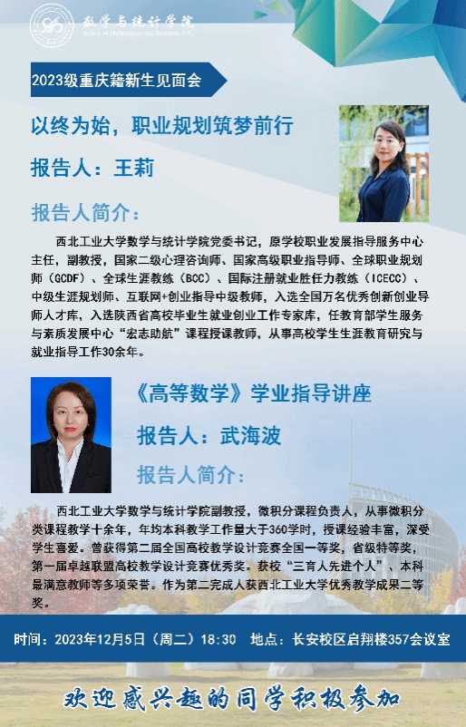为进一步促进新生融入大学学习生活,提升个人生涯规划能力和潜力,完善重庆招生宣传工作,12月5日晚上18:40-21:20,2023级重庆籍本科新生见面会在长安校区启翔楼357会议室顺利召开。体彩超级大乐透 党委书记王莉、副院长郭千桥、微积分课程负责人武海波、重庆招生组组长林伟和王振海、招生秘书李彦吉、重庆籍学生代表张颢瀚以及二十余位重庆籍新生参加,见面会由副院长郭千桥主持。