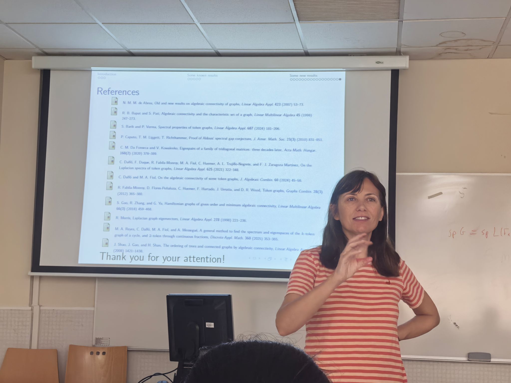 出访期间,团队与正在莱里达大学访学的张胜贵教授指导博士生宋筱頔进行深入交流,详细了解其学习科研与生活状况。宋筱頔同学在为期一年的访学中,与外方合作导师 Cristina Dalfó 教授及加泰罗尼亚大学 Miguel Àngel Fiol 教授密切协作,在 “token 图的代数连通度” 研究领域取得重要进展,已完成 3 篇学术论文(1 篇已发表,2 篇投稿中)。团队对其成果给予肯定,并鼓励她持续深耕,成为两校学术交流的纽带。