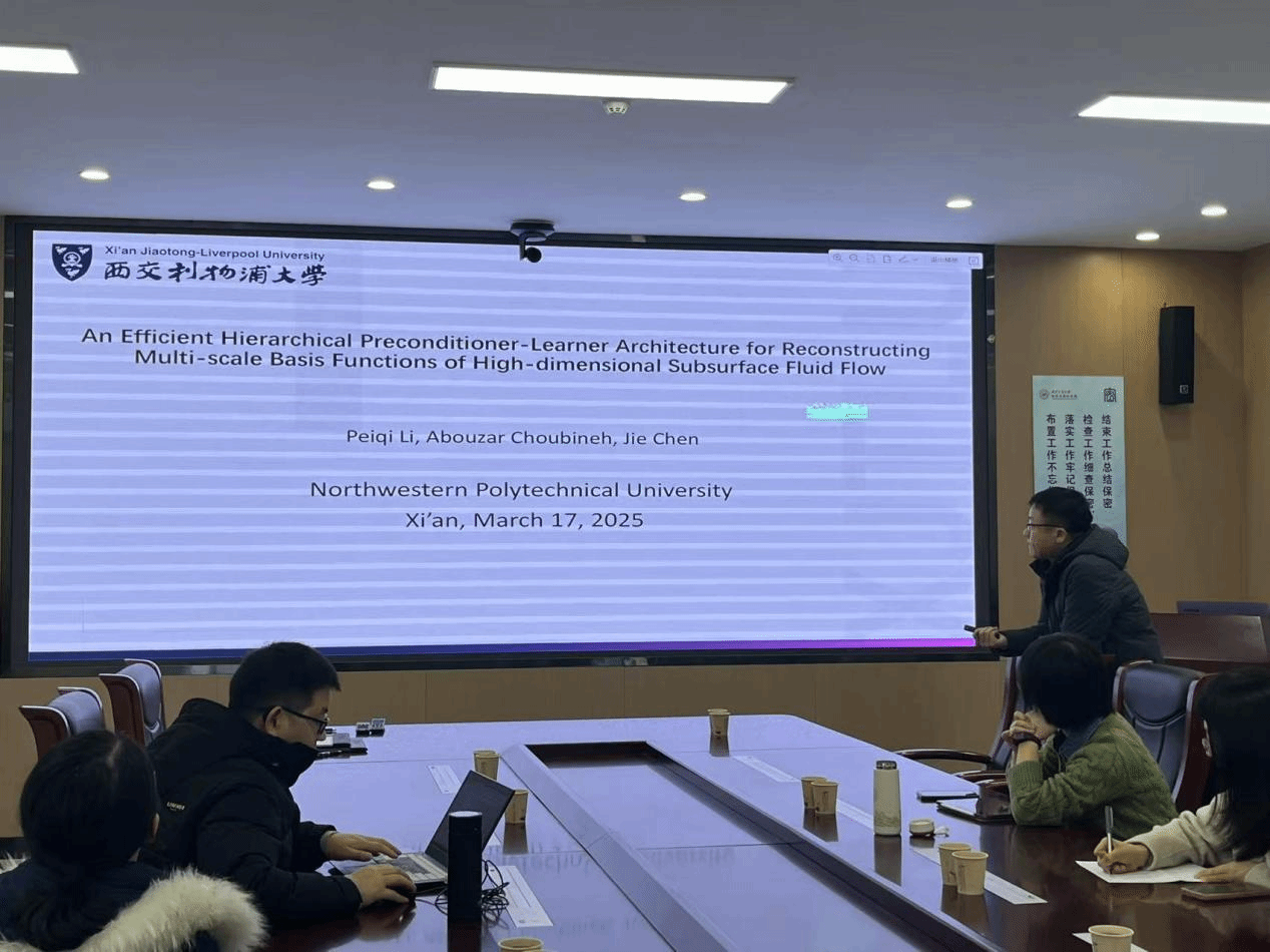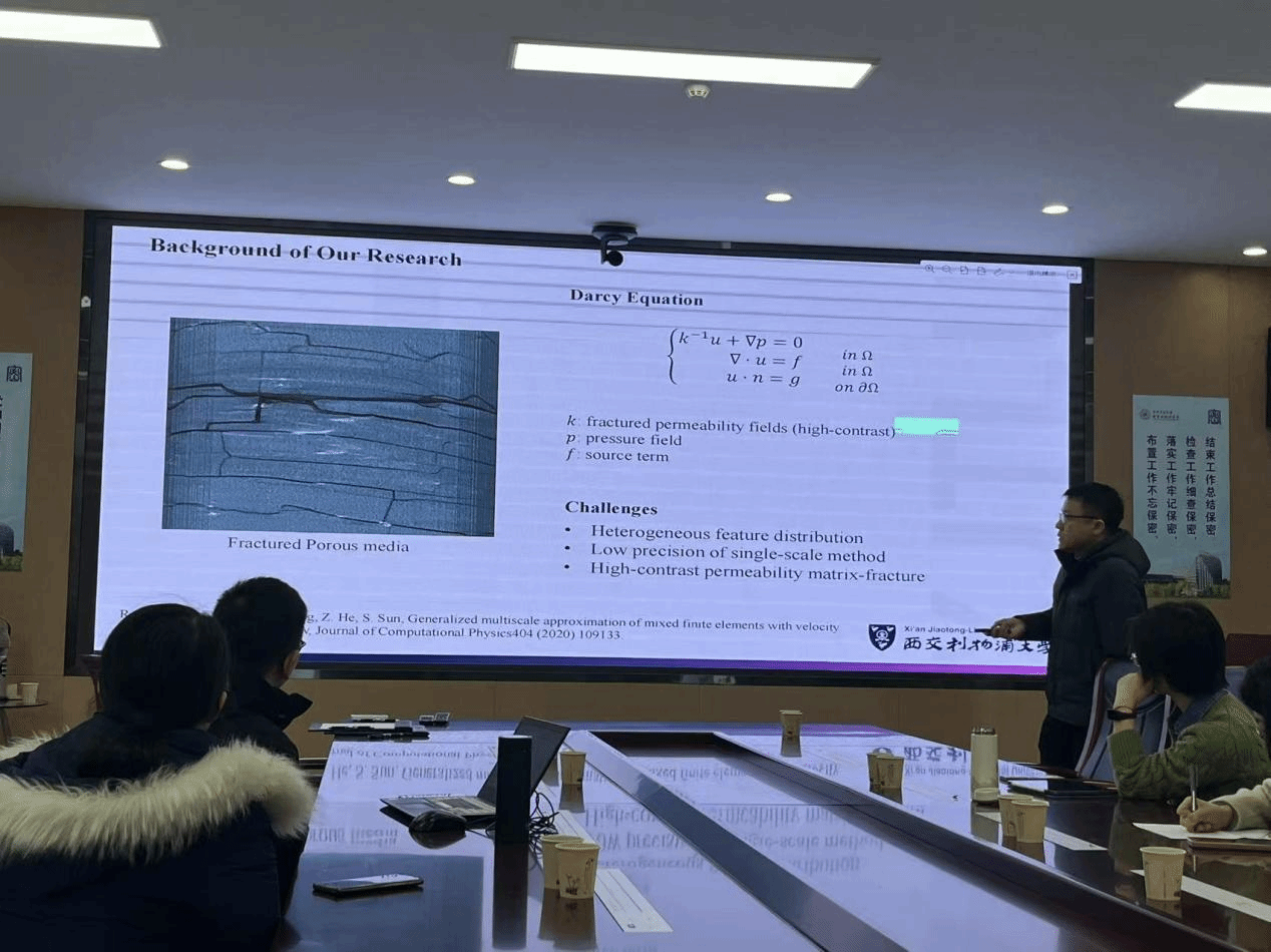 陈洁副教授以《An Efficient Hierarchical Preconditioner-Learner Architecture for Reconstructing Multi-scale Basis Functions of High-dimensional Subsurface Fluid Flow》为题,以地下渗流数值模拟问题为切入点,系统阐述了高对比度、非均质渗透率系数下的Darcy方程求解方法,他重点介绍了混合尺度有限元方法。以此为基础,陈洁提出了一种创新的压力多尺度空间基函数构建方法,该方法创新性地采用不同策略处理压力项和速度项的刚度矩阵。特别值得一提的是,陈洁还开创性地将混合多尺度方法与神经网络相结合,开发出优化算法。该算法不仅实现了显著的降维效果和计算速度提升,同时保持了良好的计算精度,为解决复杂渗流问题提供了新的思路。