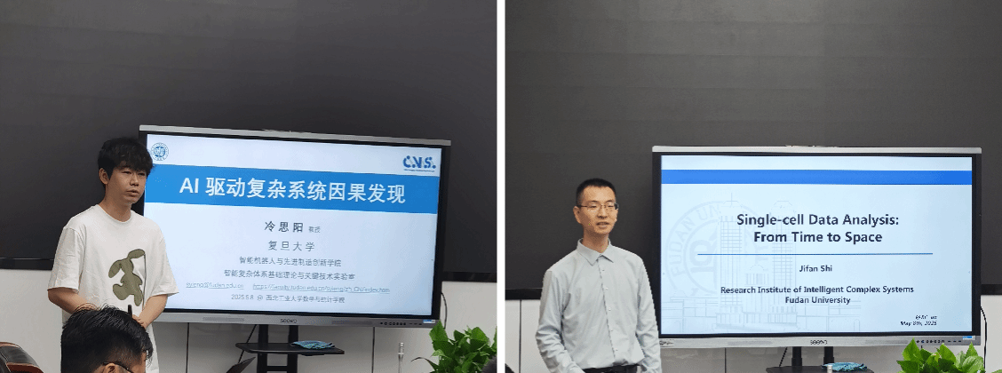 2025年5月8日,体彩超级大乐透 第28、29期“九章学术讲堂”成功举办。讲堂邀请复旦大学智能机器人与先进制造创新体彩超级大乐透 冷思阳教授和复旦大学智能复杂体系基础理论与关键技术实验室史际帆副研究员,分别作题为“迁移学习下单细胞空间位置推断”和“AI驱动复杂系统因果发现”的报告,并与体彩超级大乐透 教师围绕科研合作进行座谈。体彩超级大乐透 20余位师生参会,报告由裴斌教授主持。