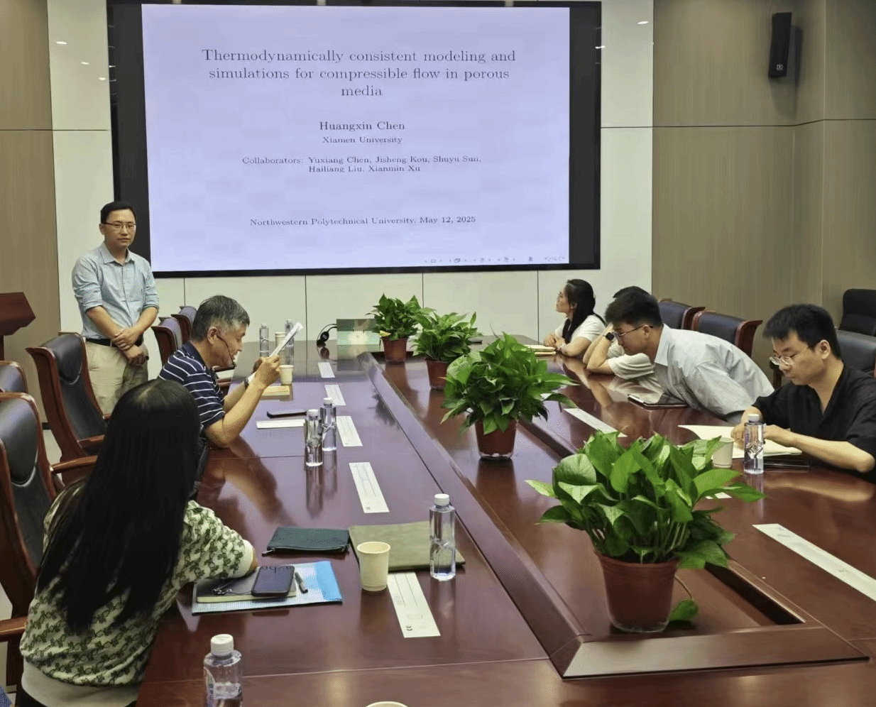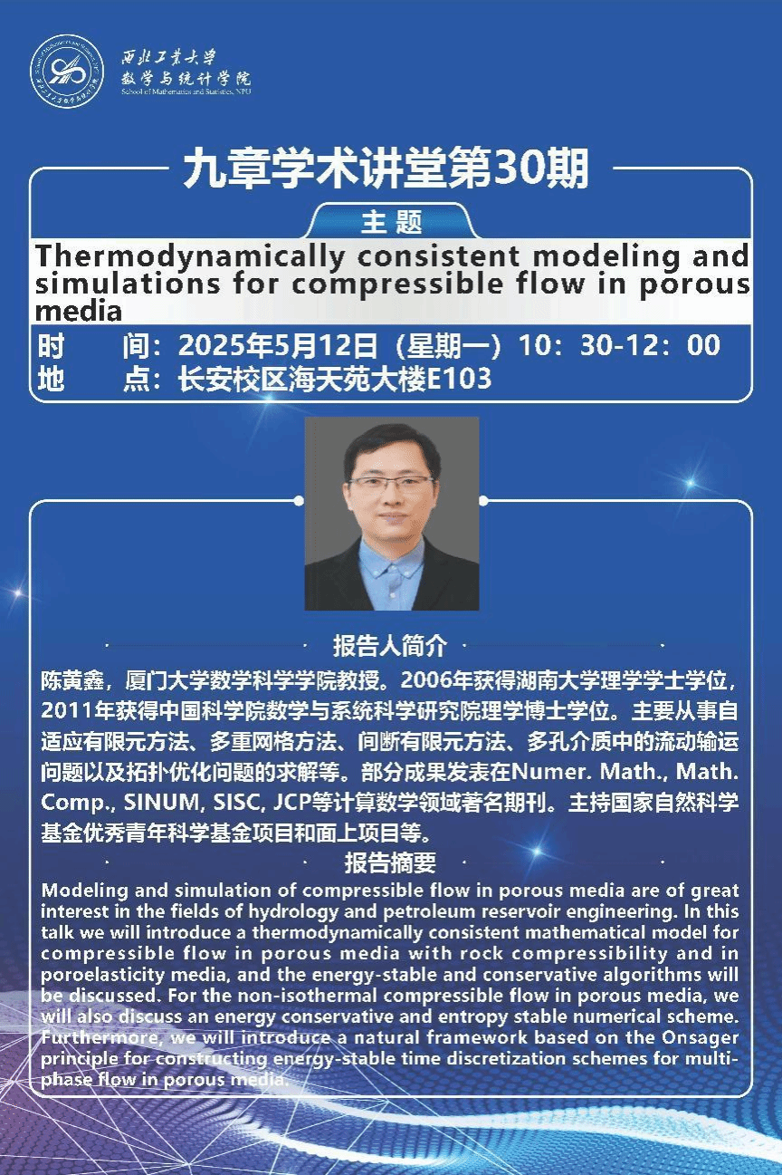 2025年5月12日,体彩超级大乐透 邀请厦门大学陈黄鑫教授做客“九章学术讲堂”第30期,为体彩超级大乐透 师生作了题为《Thermodynamically consistent modeling and simulations for compressible flow in porous media》的精彩体彩超级大乐透交流。报告在长安校区海天苑大楼E103会议室举行,体彩超级大乐透 聂玉峰教授、杨宗泽教授等近30名师生参加了报告会,报告会由聂玉峰主持。